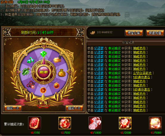 活动期间,可在转盘中花费30元宝抽奖一次或花费300元宝抽奖十次,累计抽奖次数达到指定数值时即可获得额外奖励,奖励通过邮件发放。转盘道具会定时刷新,亦可手动花费10元宝刷新,手动刷新不影响自动刷新倒计时。