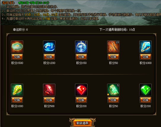 活动期间,提取元宝即可获得幸运积分,每次提取都有机率获得1.5倍积分,单次提取额度越大机率越高。幸运积分可在界面上兑换奖励,每个奖励只能兑换一次,每天10点、13点、19点、22点自动刷新,亦可手动花费5元宝刷新,刷新次数越多,极品道具出现的机率越高。