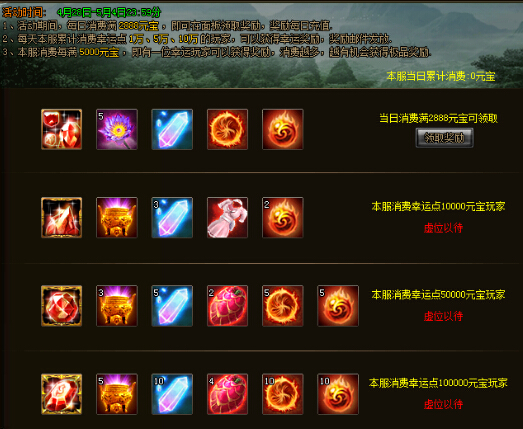 活动期间,消费满2888元宝即可领取每日消费奖励,奖励每日重置(不补发),需及时领取,本服消费每满5000元宝时会从在线玩家中抽取一位派发幸运奖励,奖励通过邮件发放,抽中玩家消费越多获得极品道具机率越高。同时,第一个使每天本服累计消费达1万、5万、10万的玩家可获得幸运奖励,奖励通过邮件发放,每天重置名额。本服累计消费每天重置。