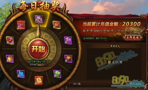 【活动内容】活动期间,玩家每充值300元宝即可获得每日转盘次数一次,转动转盘即可获得各种珍贵道具,赢取全新限量时装和极品传奇装备!