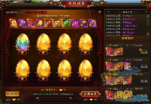 【活动内容】活动期间,玩家可以在活动界面砸金蛋,赢好礼,各种珍贵道具收纳囊中!更有机会砸到七彩金蛋,获取神秘好礼!