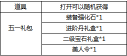 【活动内容】活动期间,玩家在罗魔密境、跨服副本中有机会获得五一礼包,打开五一礼包可以随机获得道具奖励!