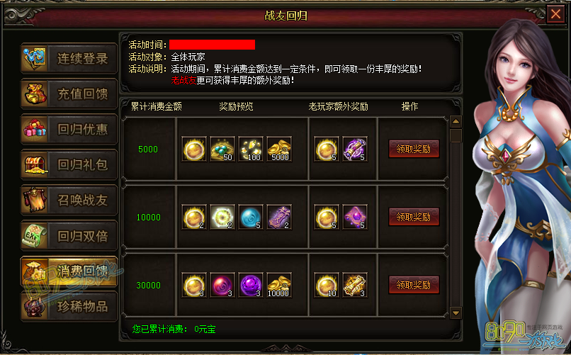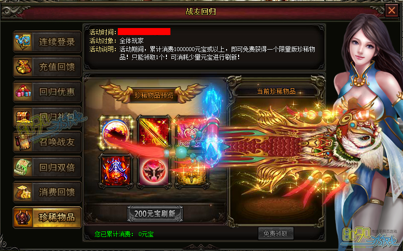 【活动说明】:活动期间,累计消费1000000或者以上,即可免费获得一个限量版珍稀物品!只能领取一个!可消耗少量元宝进行刷新!
