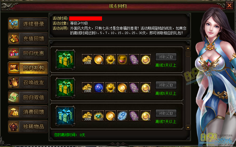 【活动说明】:外面风大雨大,只有七杀才是您的幸福港湾!活动期间登录的战友,如果您的离线时间达到3、5、7、10、15、20、25、30天,即可领取相应的礼包