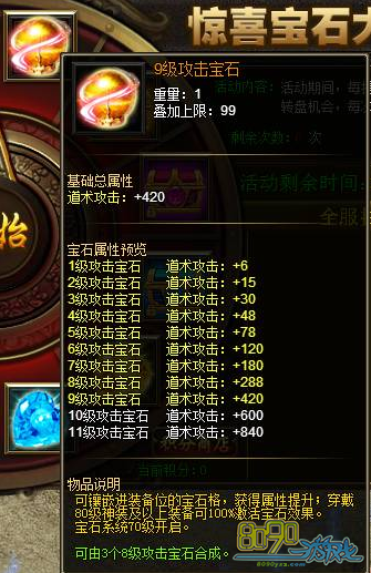 【活动内容】:活动期间,每提取5000元宝可获得1次抽奖机会,百分百中奖!可获得9级攻击宝石、8级宝石礼盒等大量奖励哦!