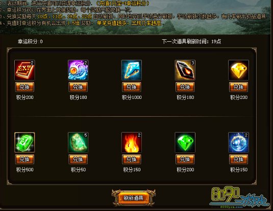 活动期间,提取元宝即可获得幸运积分,每次提取都有机率获得1.5倍积分,单次提取额度越大机率越高。幸运积分可在界面上兑换奖励,每个奖励只能兑换一次,每天10点、13点、19点、22点自动刷新,亦可手动花费5元宝刷新,刷新次数越多,极品道具出现的机率越高。