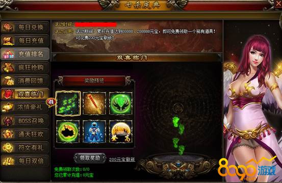 【活动说明】:每日充值达到88888、288888元宝,即可免费领取一个稀有道具!可花200元宝刷新!