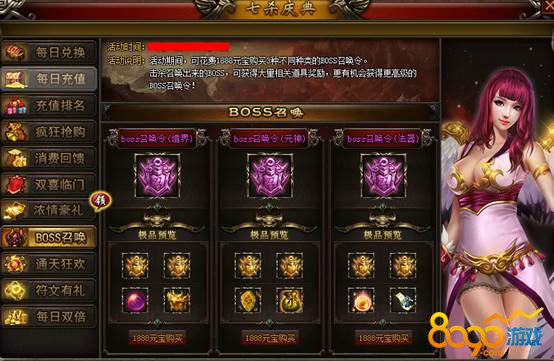 【活动说明】:活动期间,可花费1888元宝购买3种不同的BOSS召唤令!击杀召唤出来的BOSS,可获得大量相关道具奖励,更有机会获得高级BOSS召唤令!