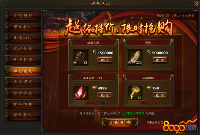 活动期间,每两小时神秘商店会自动刷新一批道具,也可花费元宝立即刷新,大量道具限时等你抢购。