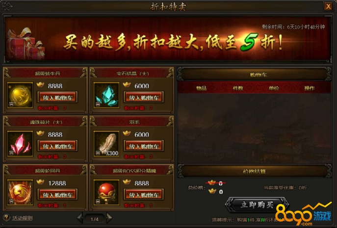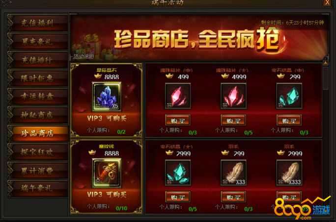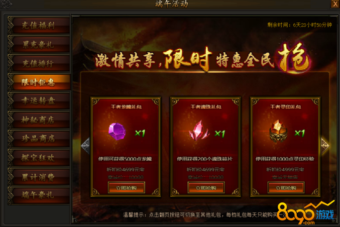 活动期间,每天会随机刷新一批特价道具,花费少量元宝即可购买,每个道具均有每天最大个人购买次数限制,部分道具有购买vip等级限制,买到就是赚到,机会不容错过!