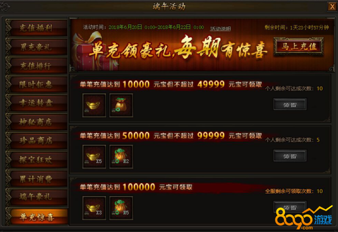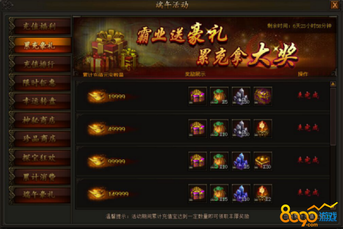 活动期间,累计充值一定数量元宝,即可领取对应档奖励,每个角色只能领取一次。