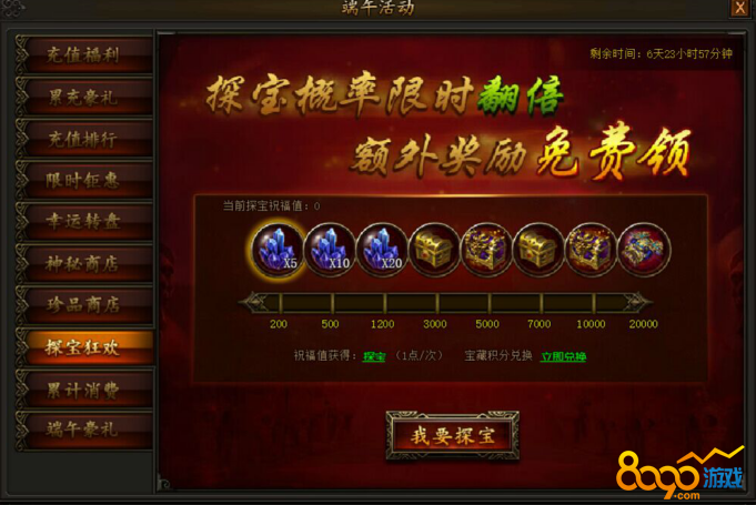 探宝超值回馈限时开启!活动期间探宝可获得祝福值,祝福值达到一定数值即可领取霸业装备奖励!