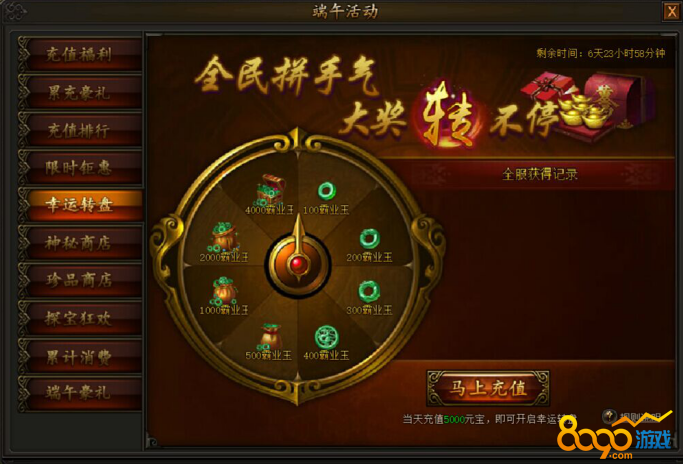 活动期间,充值并消费一定元宝即可使用幸运转盘,获得大量霸业玉道具,使用霸业玉后即可前往霸业商城内购买珍稀道具,精彩不容错过。