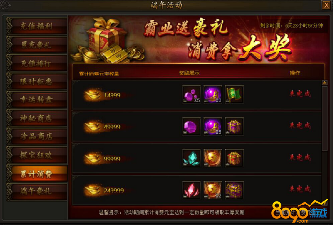 活动期间,累计消费一定数量元宝,即可领取对应档奖励,每个角色只能领取一次。