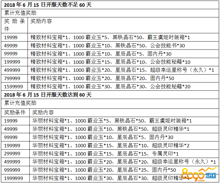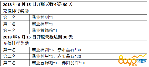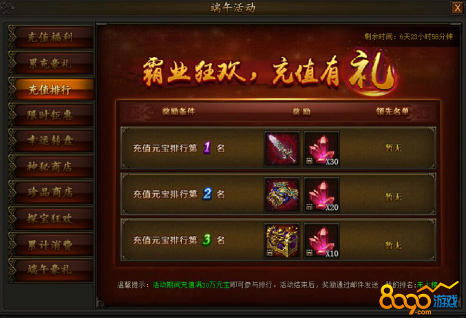 活动期间,累计充值元宝数满30w可参与排行,排行前三即可获得对应霸业装备和极品首饰奖励。