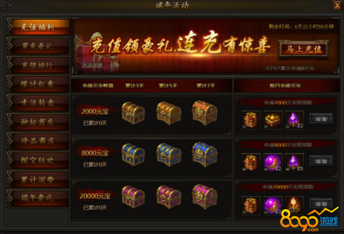 活动期间,充值满一定数量元宝,即可领取每日充值元宝对应档奖励,每档奖励每天均可领取一次,同时累计充值元宝满一定数量且达到要求天数,还可额外领取对应累计天数充值元宝对应档奖励,机会只有一次,不容错过。