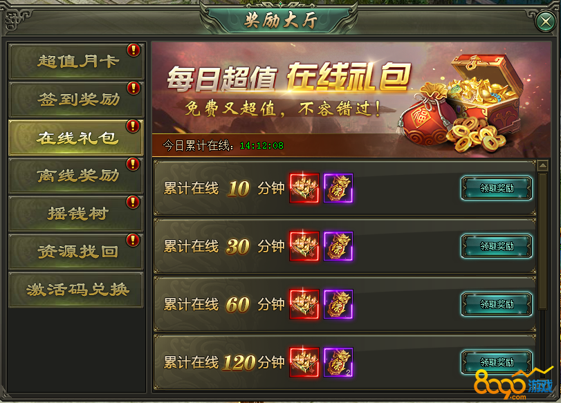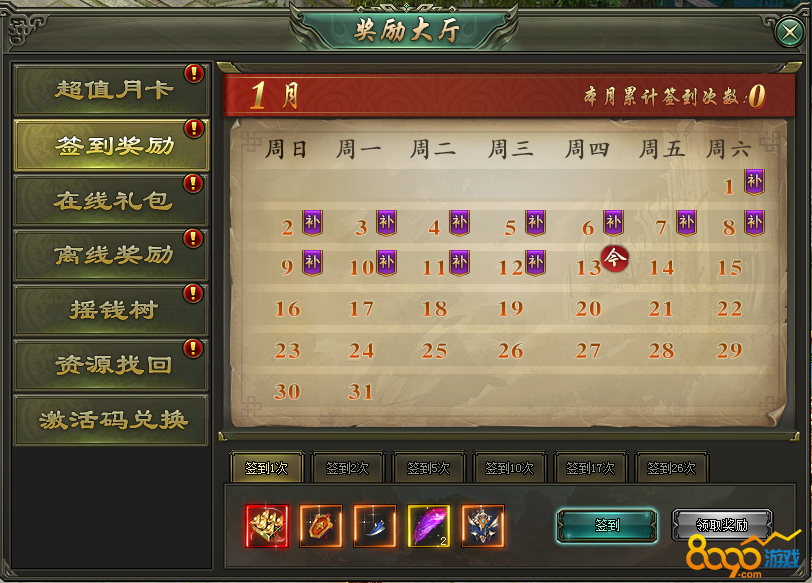 搜索"8090网页游戏"在8090王城霸主游戏中,玩家每天都可以在奖励大厅领取福利,奖励大厅包括超值月卡、签到奖励、在线礼包、摇钱树及激活码兑换功能,一起来看看吧!
