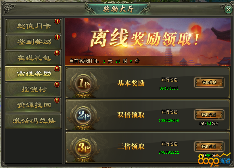 玩家进行游戏退出操作后,游戏会自动记录玩家离线时间,并将玩家的离线时间转换成经验值。玩家可以选择免费的基本奖励,也可以选择消耗钻石来获取多倍离线经验奖励