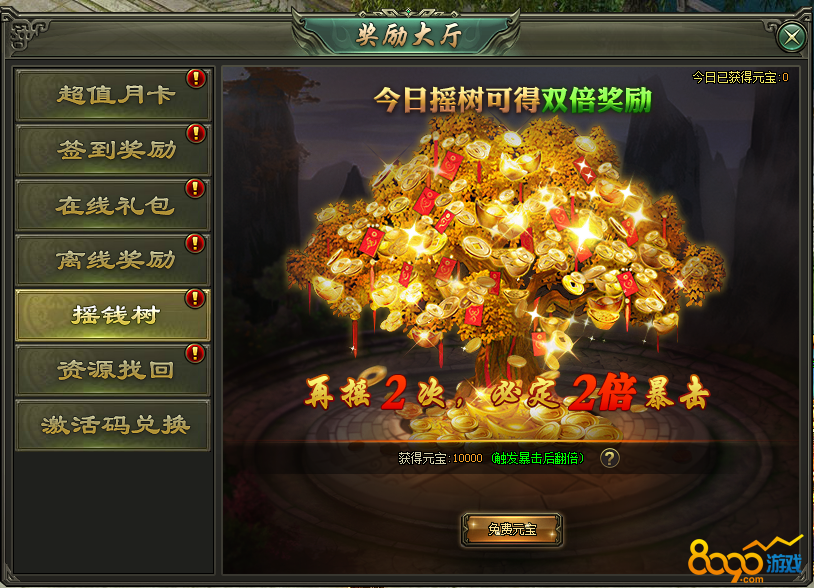 玩家每天都可以获得一次免费摇动摇钱树的机会,摇的次数越多,玩家获得的奖励越多,并且每一次摇动都有几率触发暴击获得双倍奖励