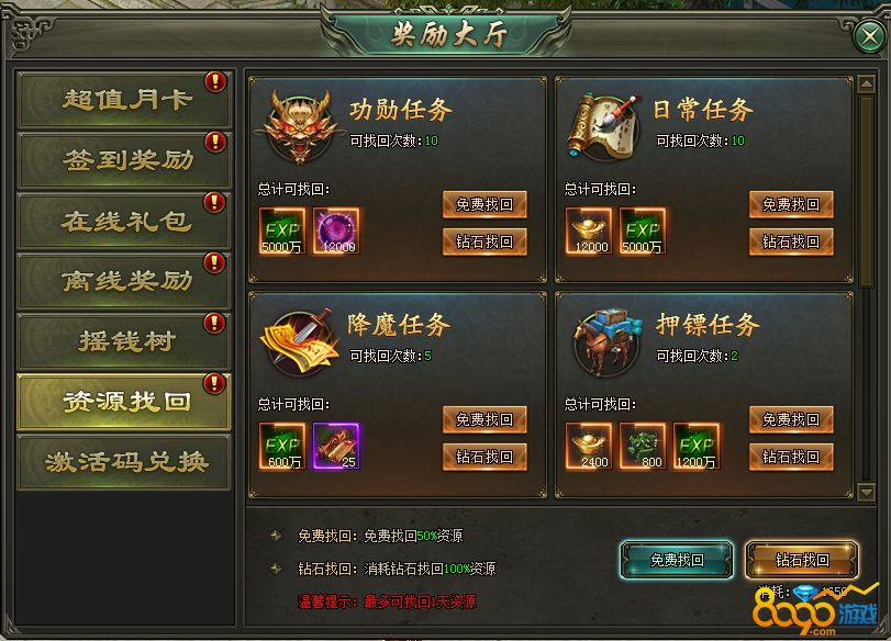 玩家可在资源找回面板找回前一天未能完成的每日任务奖励。免费找回可找回50%的资源、钻石找回则可以找回100%资源。可找回每日任务:功勋任务、日常任务、降魔任务、押镖任务、威名任务