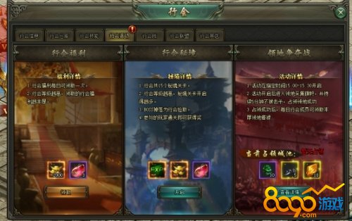 行会活动:行会福利,行会秘境和领地争夺战三种活动,所有玩家都可以参加。