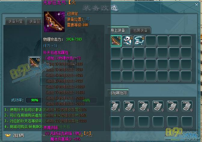 使用补天石可以激活装备上未激活的追加属性,可以在商城购买追加保护符来保证追加100%成功,对应的补天石等级可以激活对应的追加属性,商城可购买,所有BOSS均有掉落补天石,每个装备都可以追加12种属性。