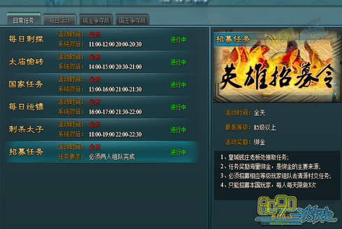招募任务全天均可接,玩家必须两人组队才能完成。玩家们在钱庄老板处接取任务之后游戏就会提示你完成招募任务所要达成的条件。