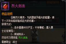 烈火剑法属于战士技能之一,您可以通过击杀boss、商城购买获得,或者可以和其他玩家交易,通过击杀普通boss千年毒蛇、兽人勇士等怪物都有概率掉落该剑法,它可以为您的武器提升伤害,一次攻击伤害会很大。