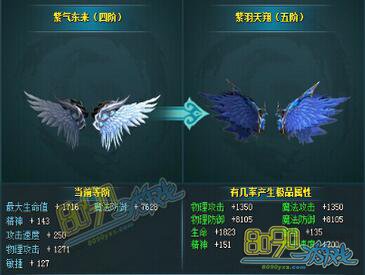 白羽之翅,属性为最大生命值+107,精神+8,敏捷+7,物理防御力+476,魔法防御+476。我们可以通过2个羽翼碎片(二等)和100个进阶石,进阶成为黑风之翼,进阶过程中有几率产生极品属性。
