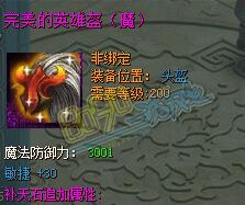 完美英雄盔基础属性为魔法防御+3001,通过使用材料对装备进行洗练,洗练属性为智力+30,通过使用补天石可以对装备经行追加属性,将初始的3001点追加到8640点,也就是追加到12级之后的属性,非常可观。