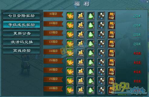 成长等级奖励共分为9个等级。当等级达到越高的时候,获得的奖励也就越丰富。当等级达到80级的时候就可以获得第一份等级奖励。50锭绑金礼包、200个进阶石、5个复活石、泡点时间卷(五倍),10%合成保护符。