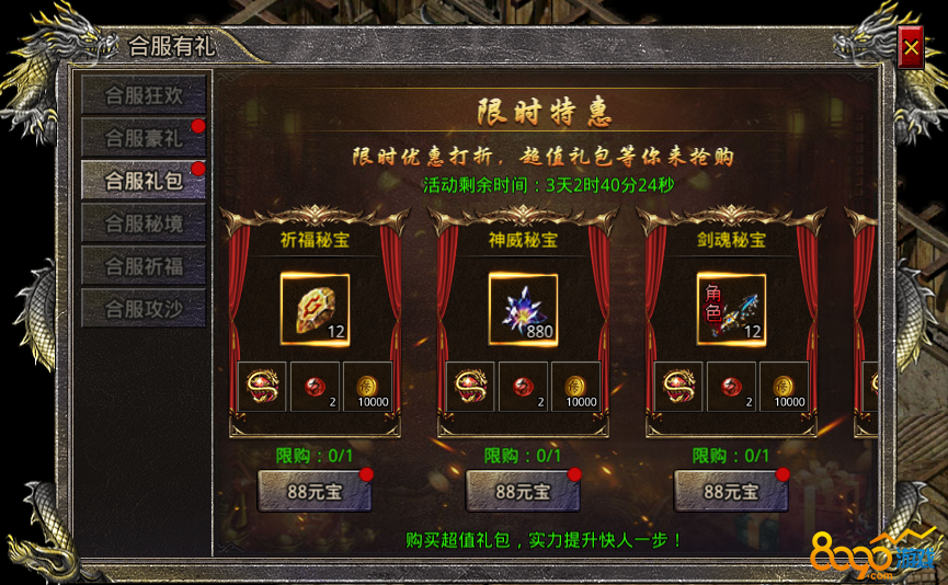 活动期间,霸主级怪物掉落合服礼盒,开启随机获得龙晶、金刚石、技能书页、血脉精华、功勋;