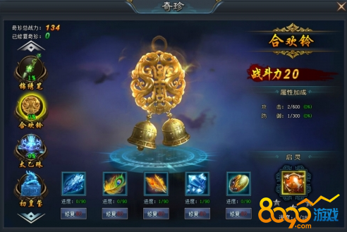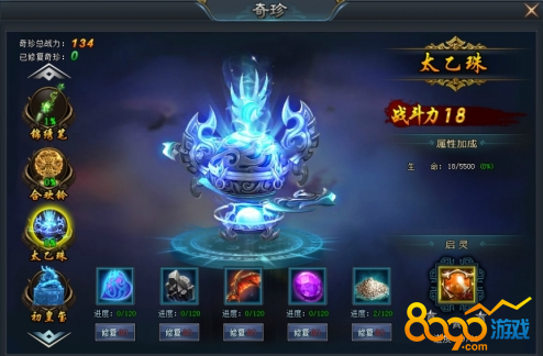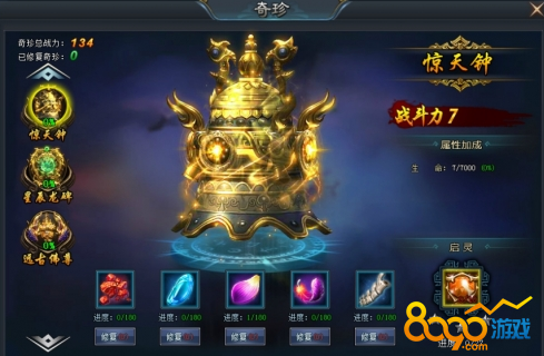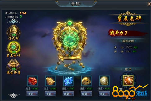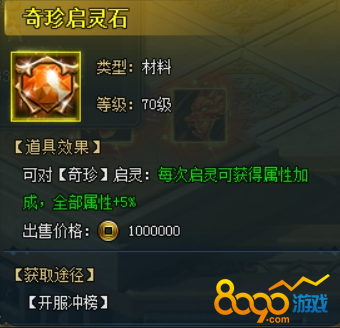 同时,对奇珍还可使用奇珍起灵石,每次启灵可获得奇珍全属性加成5%!奇珍启灵石可以通过开服冲榜活动获得。