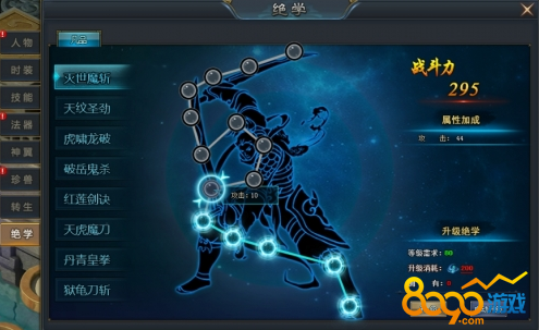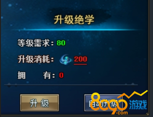 消耗真气升级绝学,获得属性加成。当上一级绝学升满级时,便可升级更高等级的绝学!。