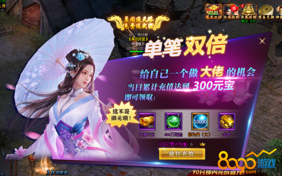 3、 活动-单笔双倍,活动期间玩家充值对应额度即可再领取等额的元宝奖励,次数有限,先充先得(开服时间大于=4天的服务器开放)
