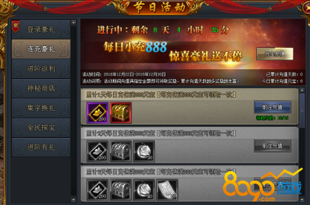 7、 活动-进阶有礼;活动时间(2018.12.22-2.18.12.28)内玩家只要登陆游戏,玩家即可领取进阶达标的奖励;奖励的进阶材料皆为当日有效,隔日即会被清除(开服时间大于=15天的服务器可以参与)