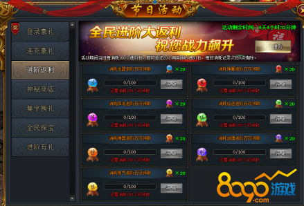 3、 活动-进阶返利;活动期间当日消耗对应进阶线的进阶材料没达到100个可以获取20个对应的进阶材料(开服时间大于=4天的服务器可以参与)
