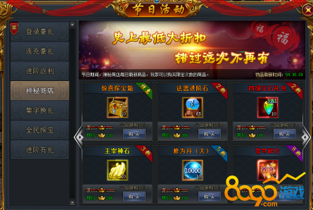 4、 活动-神秘商店;活动期间玩家可以在神秘商店中购买超值商品,商品每日有限购次数,商品每日刷新重置。(开服时间大于=4天的服务器可以参与)