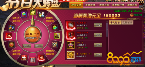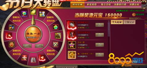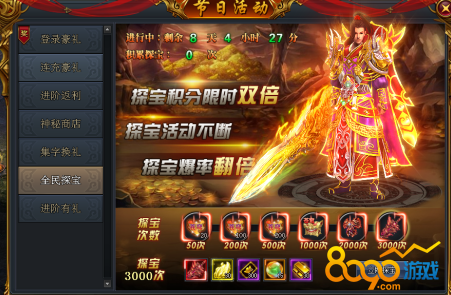 6、 活动-全民探宝;活动期间内玩家累计一定的探宝次数可以获得丰厚奖励;活动期间探宝获得的探宝积分双倍,探宝的爆率翻倍;(开服时间大于=15天的服务器可以参与)