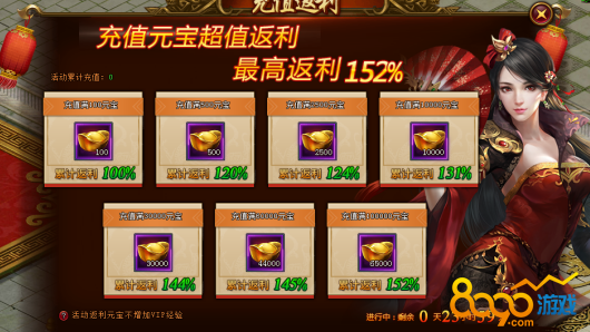 1、当日累积充值达到一定数额的rmb即可领取元宝(开服时间大于=4天的服务器开放)