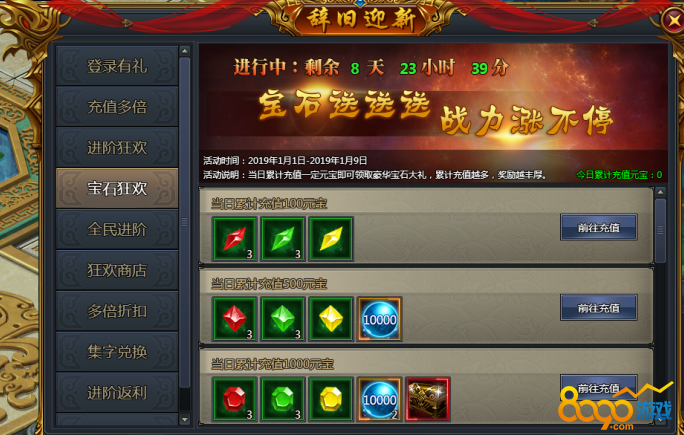 活动期间,每充值一定元宝的玩家都可以获得超值的宝石大礼包,各种高阶宝石、海量修为、特戒宝箱送不停。