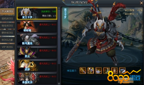 搜索"8090网页游戏"8090《武动苍穹》中,有着各式各样的BOSS。也有不少的玩家,以讨伐各种凶恶的BOSS为乐,点击界面左上角的激战BOSS,即可快速进入各种BOSS副本,让你享受虐杀BOSS的快感!