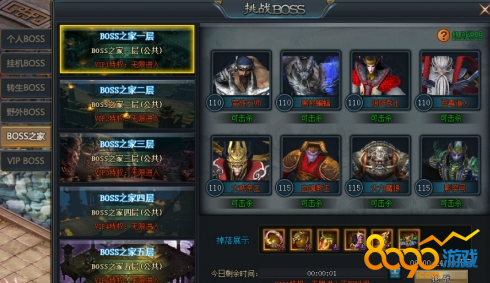 在BOSS之家中,可获得大量的装备饰品奖励,也有一定概率活动极品装备。普通玩家每天进入BOSS之家的时间有限;VIP 1用户可以无限进入BOSS之家一层;VIP 2用户可以无限进入BOSS之家二层;VIP 31用户可以无限进入BOSS之家三层;VIP 4用户可以无限进入BOSS之家四层;VIP 6用户可以无限进入BOSS之家五层;