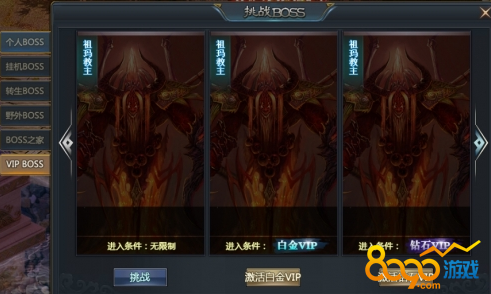 只有VIP用户才能挑战的BOSS!VIP BOSS为个人副本,安全打BOSS,从容捡装备!VIP等级越高,可以挑战的BOSS也就越强,掉落的装备也就越极品,各位一定要抓紧机会,激活VIP,挑战属于自己的BOSS,掉落更多更极品的神装!