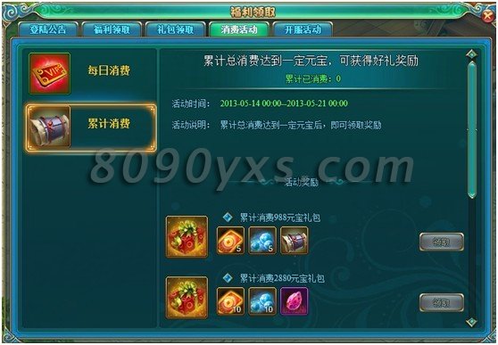 活动期间,累计消费达到一定的元宝,即可领取对应数值的奖励