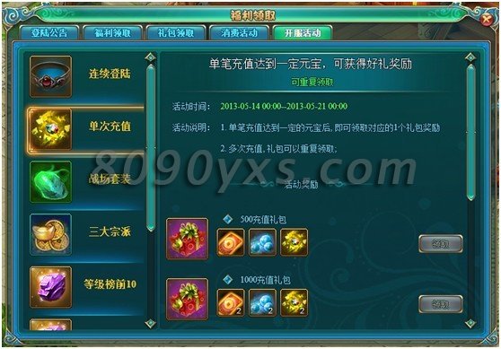 1. 单笔充值达到一定的元宝后, 即可领取对应金额礼包