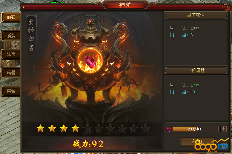 它的特点如下:血石系统可以给角色带来巨额生命加成,升级血石系统可以提升角色的闪避能力。