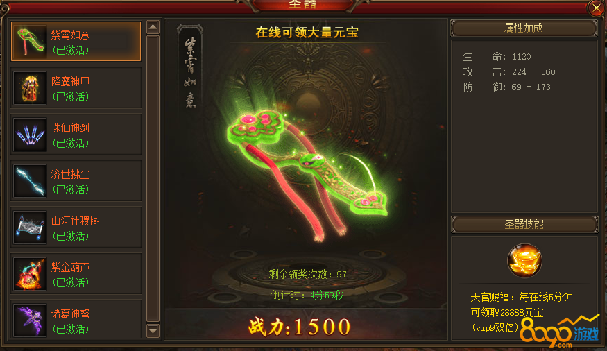 在8090问剑游戏中只要登录即可激活神器,每件神器都带有1个实用的技能。