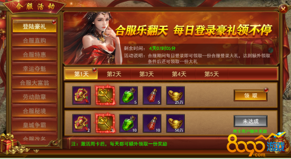 合服乐翻天,每日登陆豪礼领不停,周卡用户可额外在领一份。