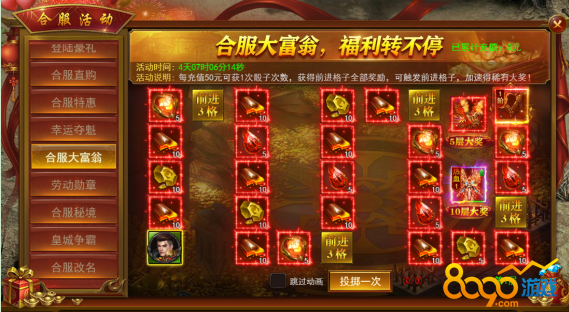 活动期间可充值获得骰子次数,掷骰子获得前进步数,走过格子即可获得的奖励或效果,如触发前进格子,可以加速获得稀有大奖。